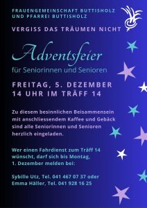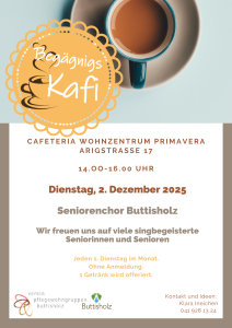 | Seniorenchor | Jeden 4. Freitag des Monats 13.45 Uhr im Träff 14 Hurni- Bühlmann Hildegard, Sebaldematt 13, 041 928 16 62 |
