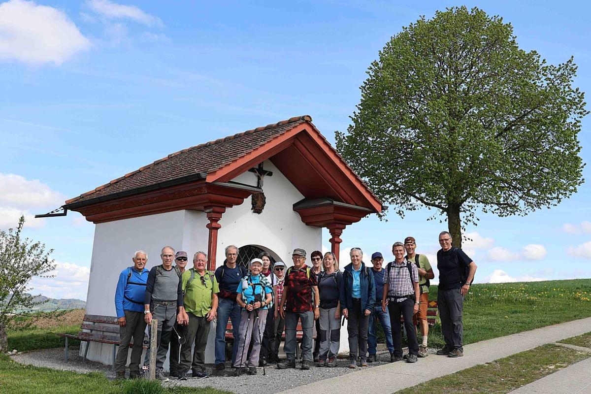 Auf dem Weg zum Hügelzug Erlosen wurde bei der zierliche St. Wendelinskapelle ein Gruppenfoto geknipst. Zwischen dem Schwarz- und Chüewald bot sich eine herrliche Aussicht über das Seetal mit Baldegger- und Hallwilersee. Ruth erklärte uns, wie die Dörfer und Weiler im Seetal alle heissen.