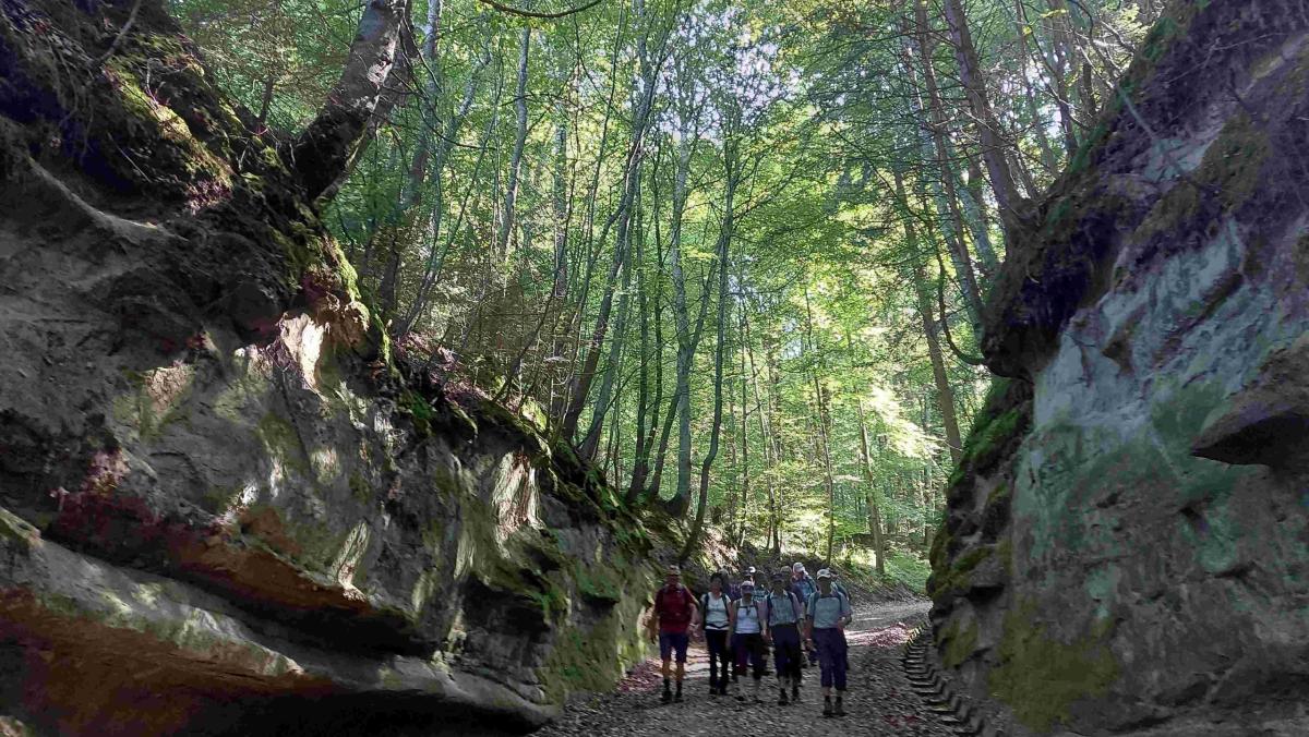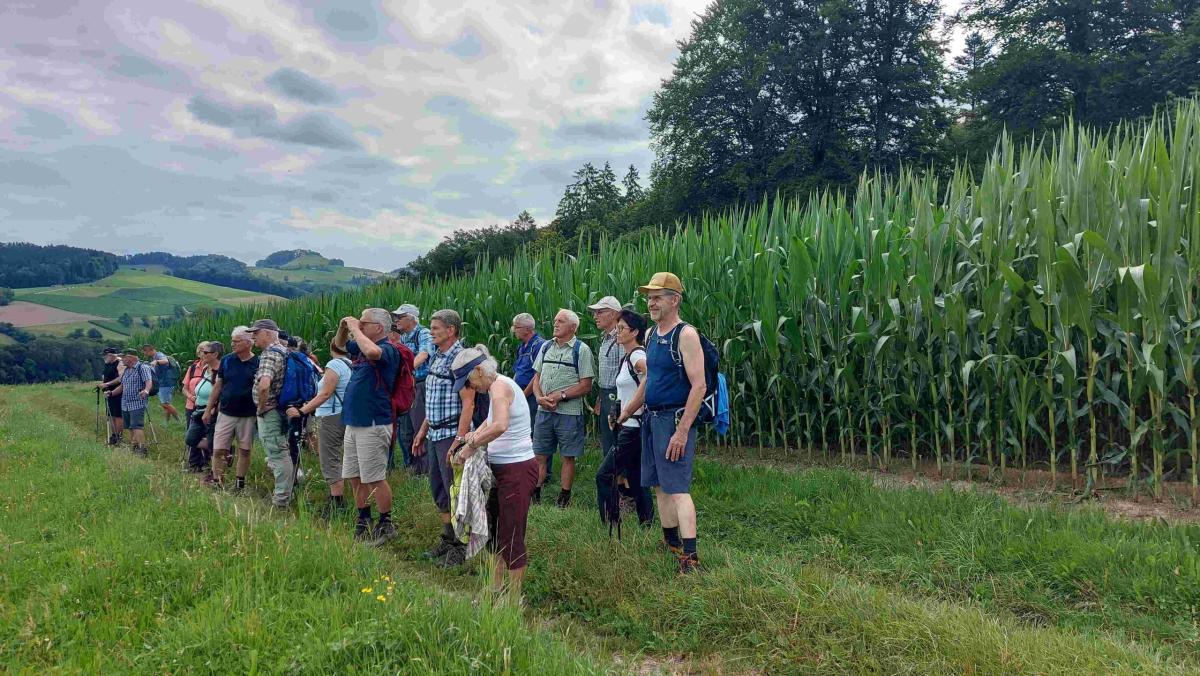 Bericht: Diesen Wandertag im Emmental wollten sich viele Seniorinnen und Senioren nicht entgehen lassen. Die Reise führte über Olten nach Wynigen. Vor und in der kleinen Bäckerei Meier konnte ein gutes Buttergipfeli genossen werden und für 28 geschmackvolle Kaffee’s brauchte es halt eine gewisse Zeit. Das liebliche Emmental und die Bevölkerung waren spürbar. Schon oberhalb des Dorfes war eine Frau am Pflümlibaum schütteln und empfahl uns die süssen Früchte zu geniessen. Auf der ersten Anhöhe, dem Jumpfereblick, zeigte sich eine tolle Aussicht über das Dorf Wynigen bis zum Jura. Die Wanderung führte durch den Hirserenwald nach Bickigen, Matten zum Picknickplatz im Weidwald. Alle konnten sich gut verpflegen, erholen und diskutieren, und was war das für eine Waldmaus? Auf dem weiteren Weg trafen wir auf goldgelbe reife Getreidefelder und Weiler im typischen Emmentaler Stil. Nun folgte die eindrucksvolle Leuenhohle mit den hohen Sandsteinwänden. Dies war bis 1882 der Verkehrsweg von Bern, Burgdorf, Huttwil nach Luzern. Zwei Kreuze, die in den Sandstein gehauen sind, sollen auf einen Mord zurückgehen, der sich im Jahr 1713 abgespielt habe. Um den Mittag wurde es immer sonniger und bald konnte der Durst im Landgasthof Sommerhus gelöscht werden. Nach dieser gemütlichen Pause auf der Gartenterrasse ging es durch den kühlen Wald zur Brücke über die Emme nach Burgdorf. Die Wanderung führte durch die Untere Altstadt, über die lange Stiege hinauf zum Stadtpark. Unterwegs waren grosse Eisen-Skulpturen des Künstlers Bernhard Luginbühl zu bestaunen. Schon bald trafen wir beim Bahnhof Burgdorf ein. Die Rückreiseroute war kein Witz, wie einige glaubten. Mit Umsteigen in Langenthal, Willisau (BLS Langenthal-Luzern) und Ettiswil erreichten wir nach einem erlebnisreichen Tag Buttisholz.
