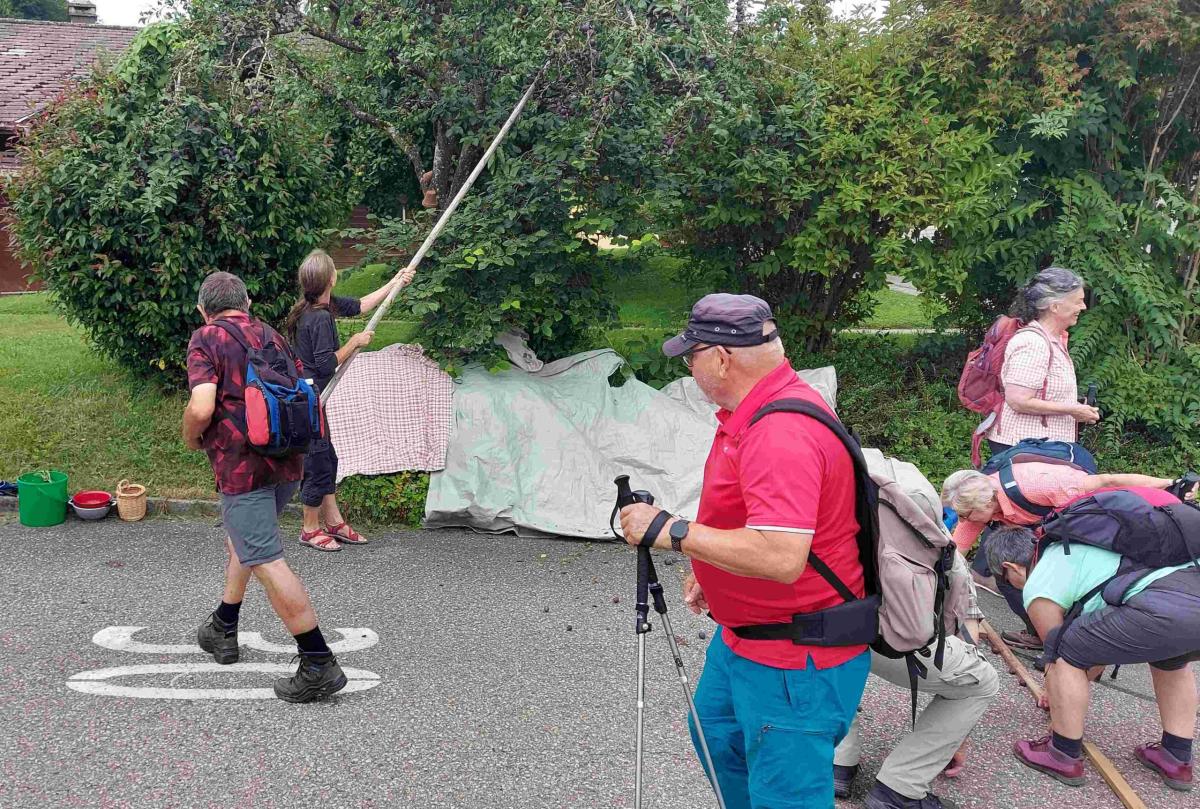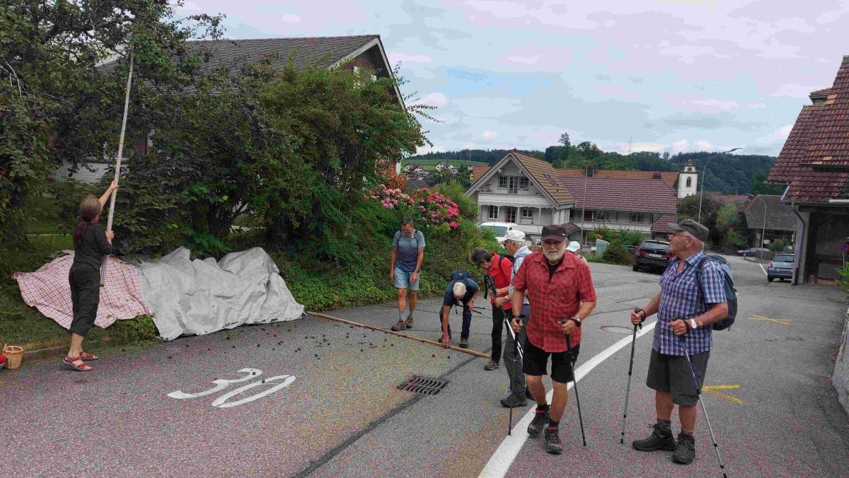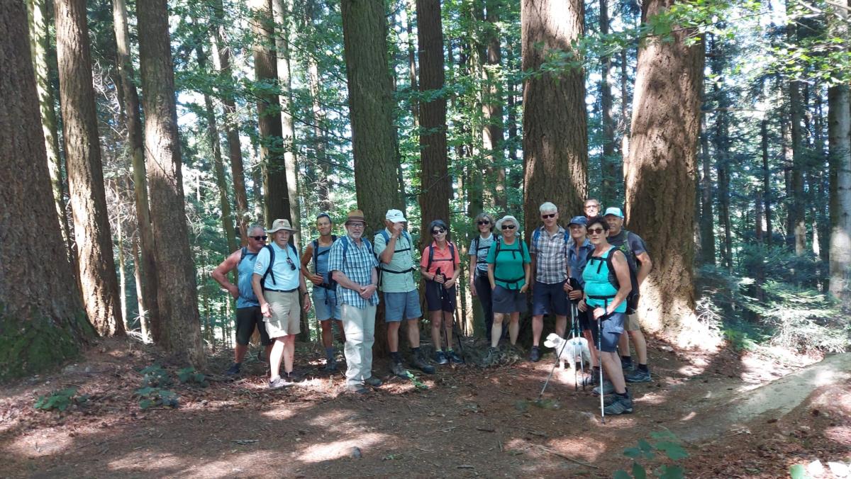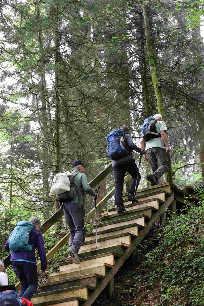 Ein kühles Lüftchen begleitete die ganze Gruppe auf dem ersten Abschnitt von Melchnau nach Pauli. Die Geniesser gönnten sich hier eine Pause, die Sportlichen begaben sich auf den steilen Waldweg zur Hochwacht. Der Aufstieg über 110 Treppenstufen lohnte sich, die Aussicht auf die Alpen und Ortschaften war überwältigend.