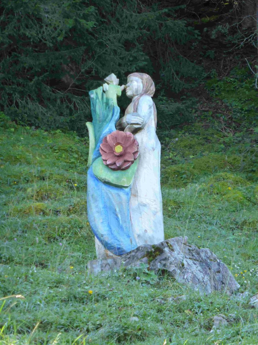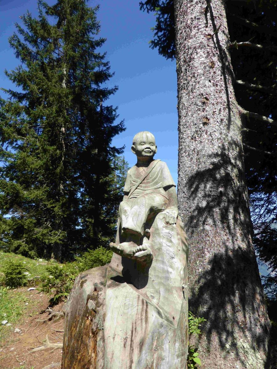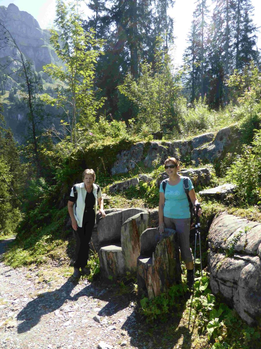 Der Dienstagmorgen zeigte sich herbstlich und wolkenverhangen. Nach dem Brünig lichtete sich der Nebel. Bei strahlendem Sonnenschein konnten wir auf der Axalp losmarschieren. Für beide Gruppen, Sportliche und Geniesser, begann die Wanderung auf dem Schnitzlerweg. Der Weg ist gesäumt von zahlreichen Schnitzfiguren, die Holzbildhauer aus Brienz geschaffen haben. Seit dem Lawinenwinter und dem Sturm Lothar 1999 verwandeln die Schnitzler jedes Jahr einige Baumstrünke in kunstvolle Figuren.