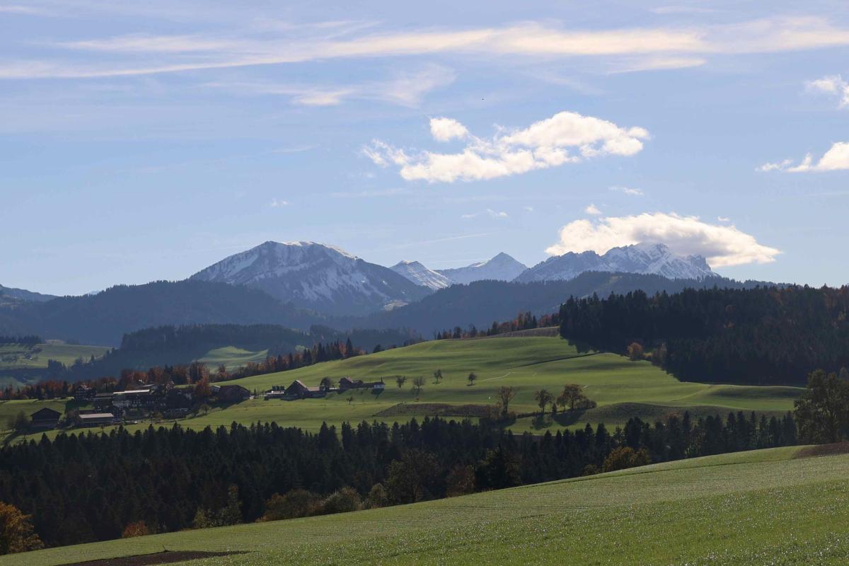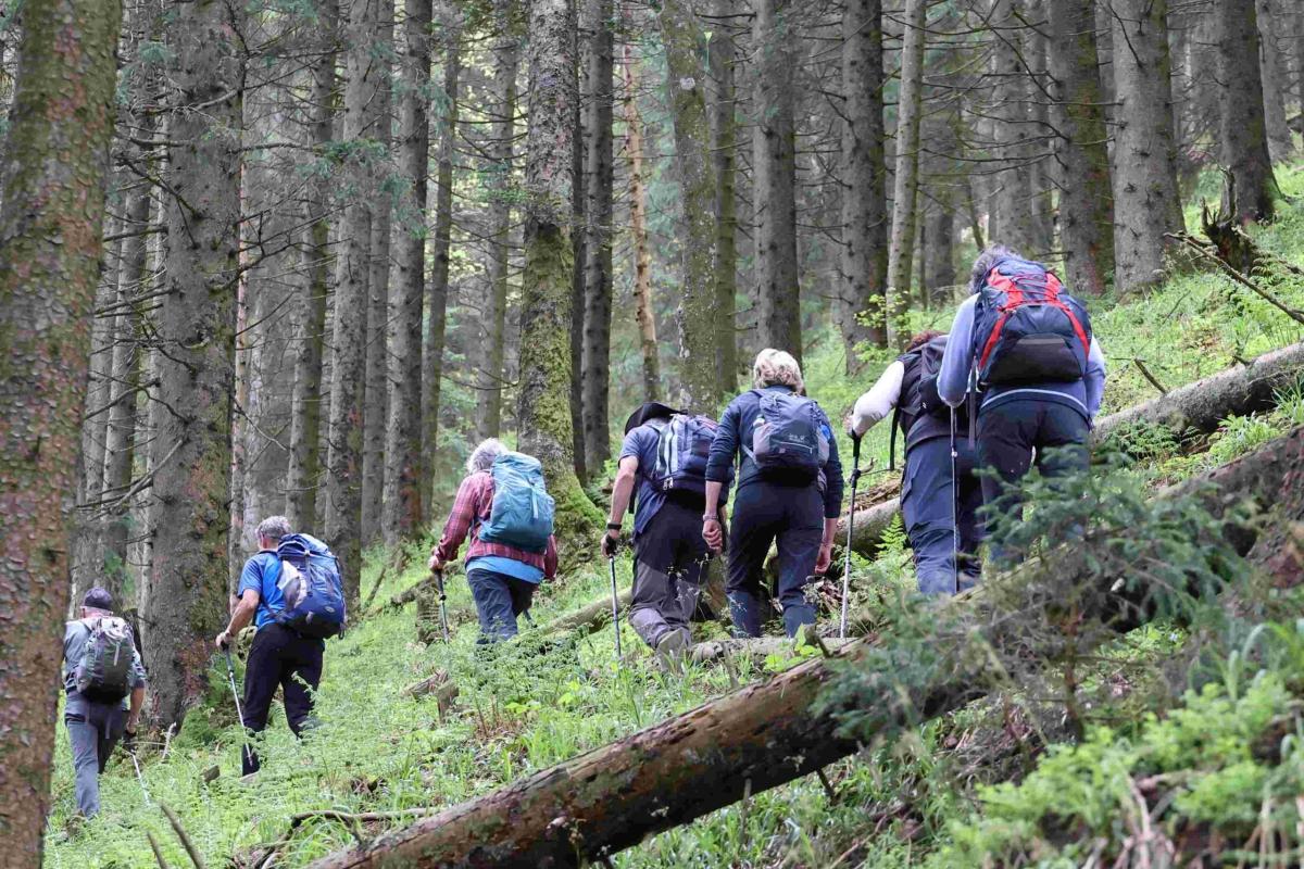 Mit vollem Magen, zuerst noch etwas zaghaft, wandern wir zickzack durch den Wald Richtung Farnere. Die Aussicht dort oben auf den Schimbrig, die Äbnistetteflue und die Schafmatt ist die Belohnung für den schweisstreibenden Aufstieg. Die Geniesser wählen die Route zur Reistegg, Neuschwändi nach Heiligkreuz, wo sich die ganze Wandertruppe wieder trifft, in der Beiz.