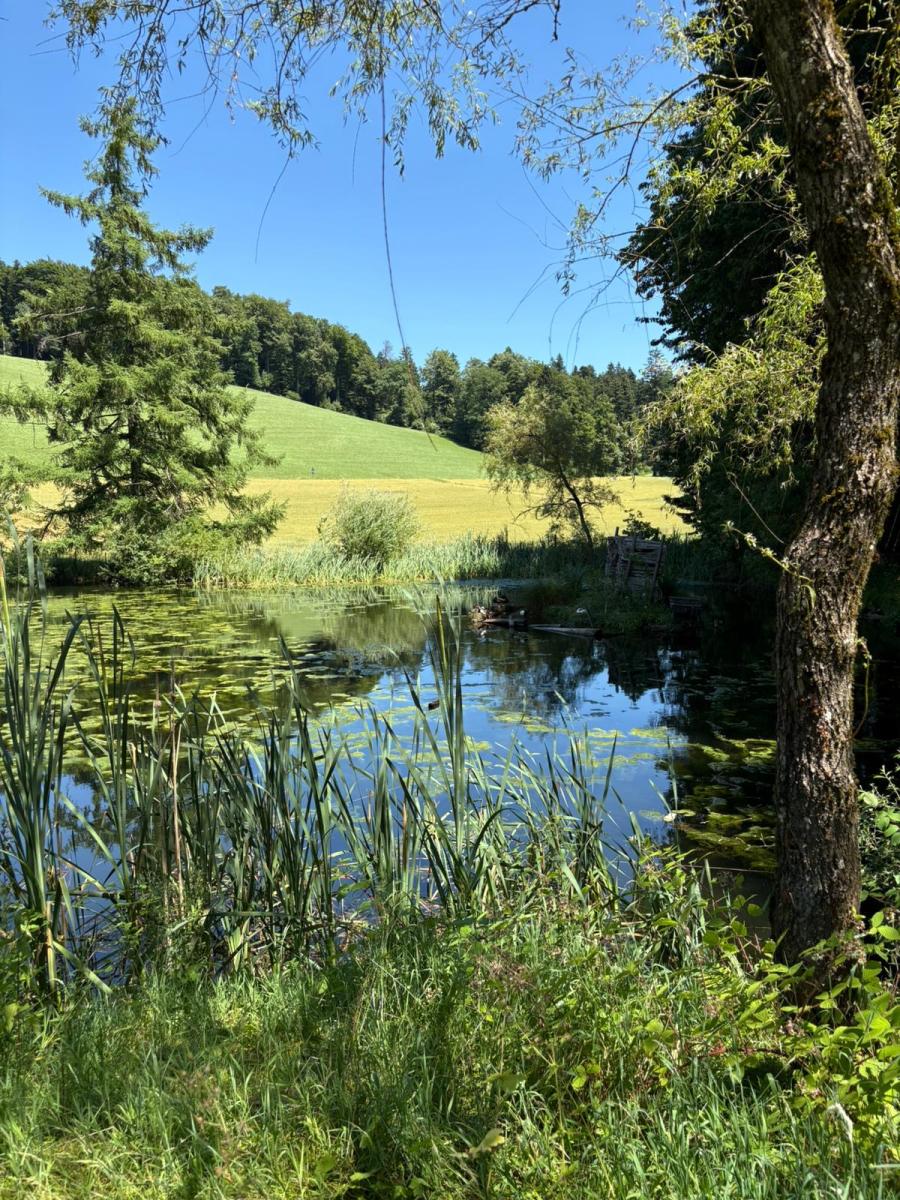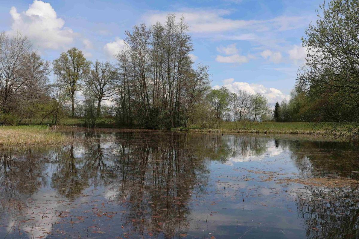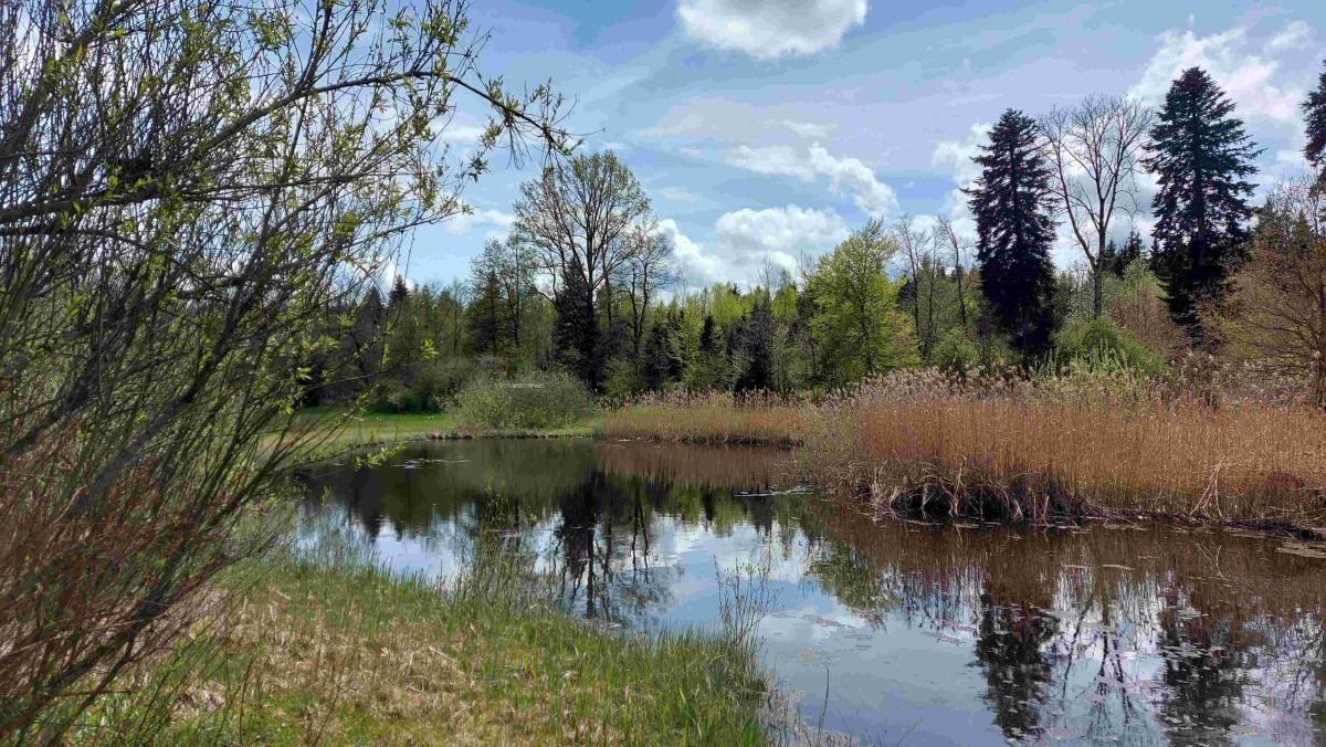 Nun folgte das Naturschutzgebiet Vogelmoos mit seinen idyllischen Weihern, wo sich die ersten Amphibien zeigten. Der Weg verlief vorbei an grossen Höfen. Beim Stall Bromen wurde der Melkroboter studiert und fachkundig diskutiert. Welche Kuh erkämpft sich den Zugang zum Melkstand um das prallvolle Euter zu entlasten? Wie findet der Roboter die Zitzen?
