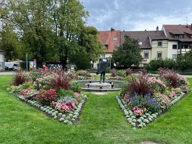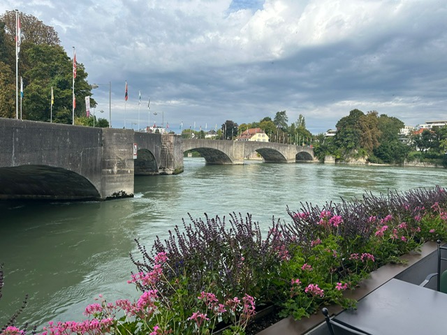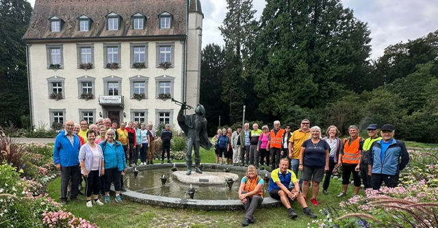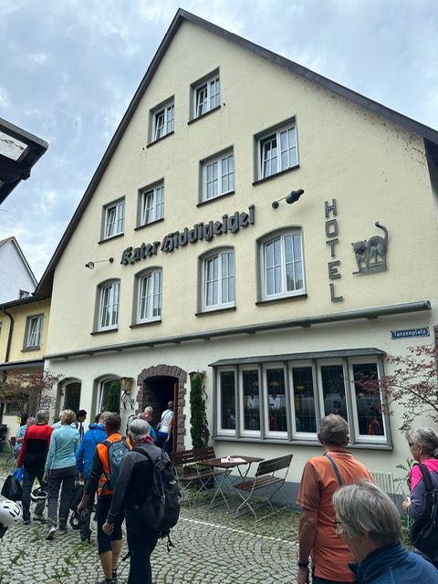 Nach der alten Zollbrücke über den Rhein radelten wir auf der deutschen Seite dem schönen Rhein entlang, flussaufwärts auf gepflegten Velowegen. Durch eine grüne, romantische Natur, vorbei beim Schloss Beugen, erreichten wir schon bald unser Mittagsziel Bad Säckingen. Der Trompeter von Säckingen war stolz auf unseren Besuch. Im einzigartig blumengeschmückten Park durfte ein Gesamtfoto nicht fehlen. Im Hotel Kater Hiddigeigei wurden wir verpflegt bei gemütlichen Zusammensein.