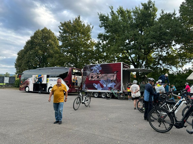 Pünktlich um 6.45 Uhr besammelten sich 34 Velobegeisterte zum Verladen der Fahrräder auf dem  Hirschenplatz Buttisholz. Speditiv konnten alle E- Bikes in den speziellen Anhänger der Firma Gössi verladen werden. Die schöne Fahrt führte uns bei  wunderbarem Wetter über Solothurn nach Biel. Beim Restaurant Joran, bei der Schiffslände in Biel, wurden alle mit Kaffee und Gipfel verwöhnt.