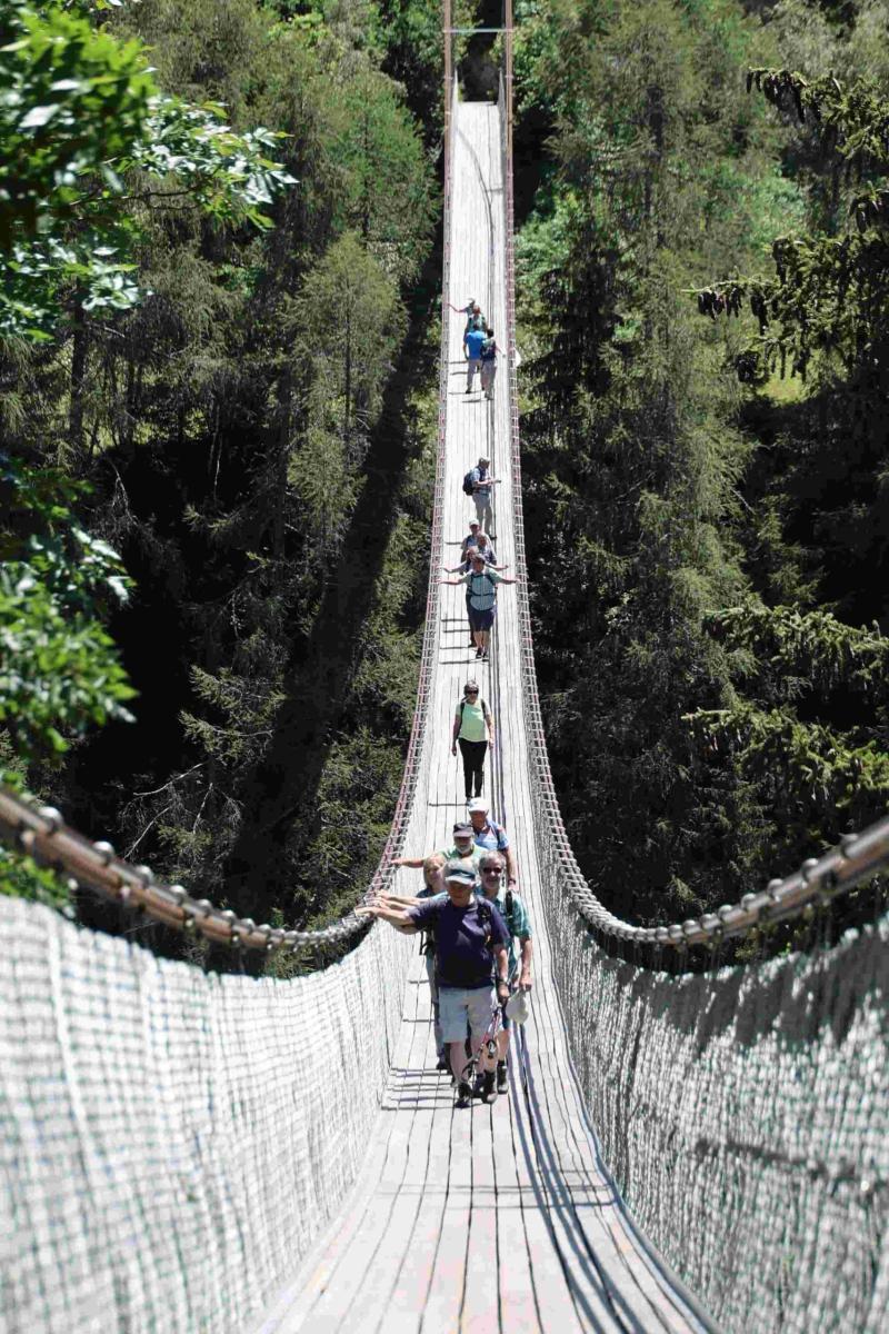 Mit der kurzen Wanderung über den Erner Galgen zum Café-Hängebrigga endeten die Wandertage. Nun war nur noch die 280 Meter lange Hängebrigga über der Rotte mutig zu bewältigen und dabei ab und zu einen Blick in die 92 Meter tiefe Schlucht zu wagen. Zeitgleich mit der Anfahrt des Zurkirchen-Reisecars erreichten wir Fürgangen. Nach einem kurzen Halt auf dem Grimselpass reisten alle mit schönen Erinnerungen nach Buttisholz zurück.